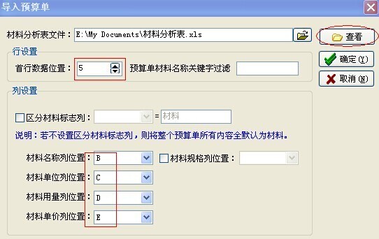 3. 在材料預(yù)算單導入設(shè)置窗口中設(shè)置導入?yún)?shù)如下: