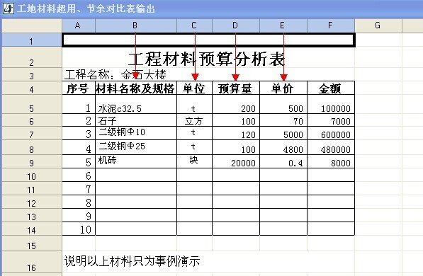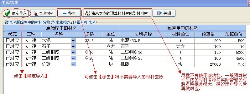 注:以上只是演示了導入預(yù)算的全過程,在實踐當中還是建議用戶只將大材料用手工【添加】的方式建立預(yù)算單,因為零星的材料名稱多而且繁雜,如果也要將零星材料從預(yù)算中導入、再做一一對應(yīng),這樣勢必給用戶帶來很大的工作量。況且零星材料也不好準確估算出實際用量。