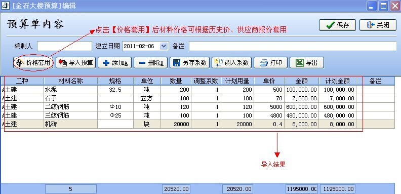 2. 在材料預(yù)算單內(nèi)容編輯窗口中,采用【導入預(yù)算】的功能方式。