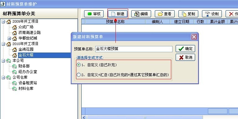 1. 打開【材料管理】模塊中【材料預(yù)算單】,選中項目后點擊【新建】按鈕創(chuàng)建材料預(yù)算單。