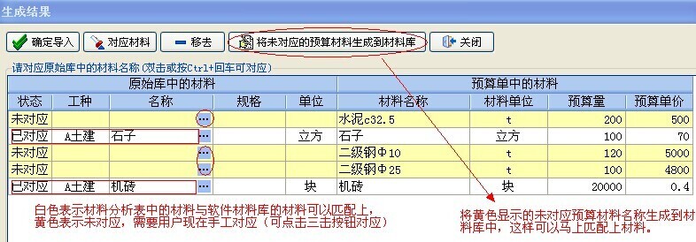 導入完的生成結(jié)果,(由于預(yù)算軟件中生成的材料分析表里的材料名稱與實際發(fā)生的材料名稱有些差異,這里需要用戶將未對應(yīng)的材料做下手工匹配)