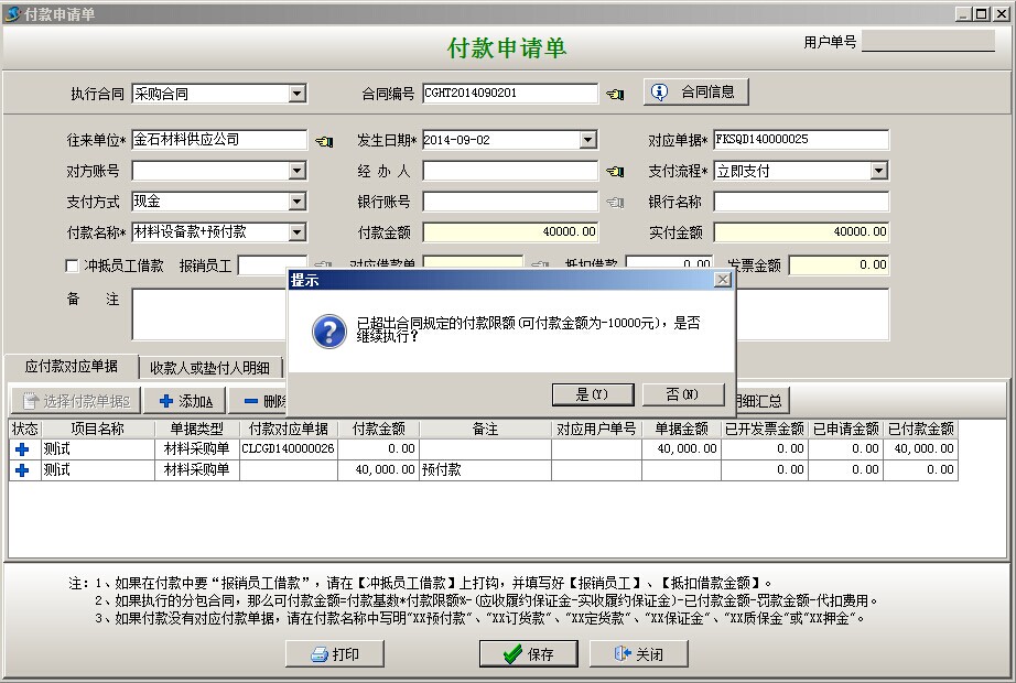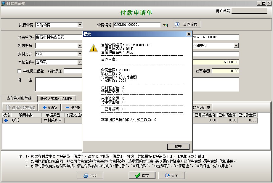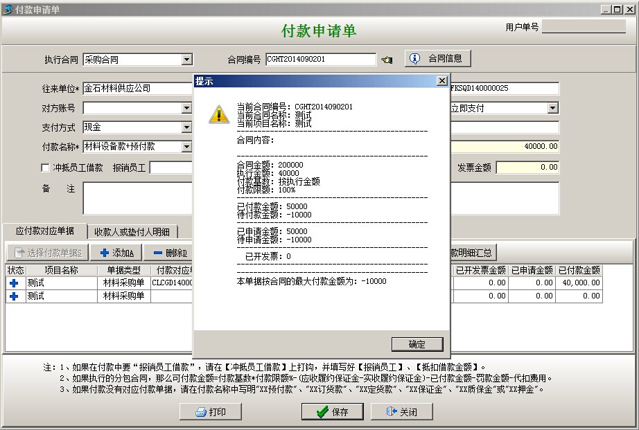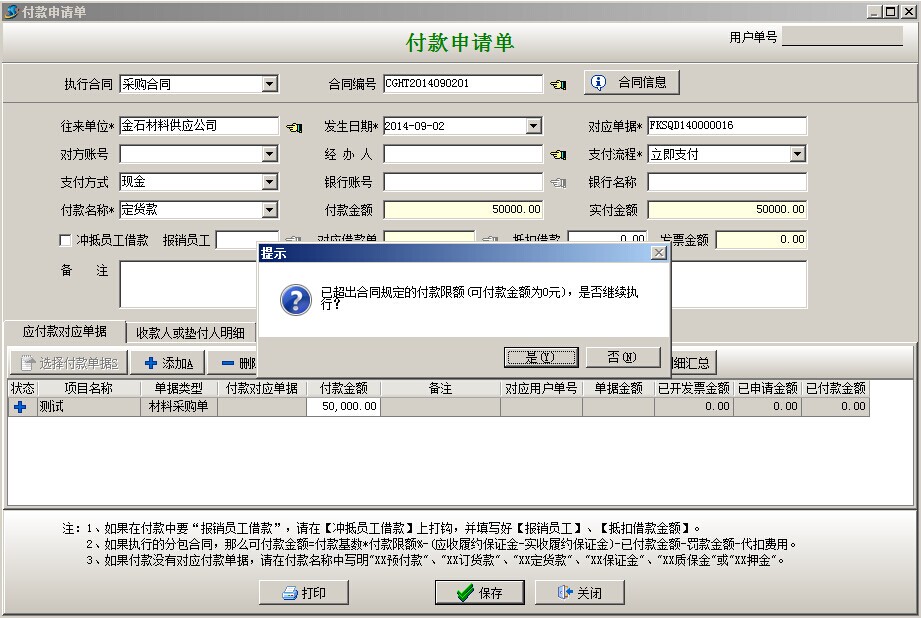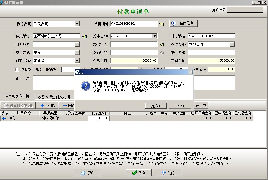 彈出付款申請單,付款名稱自動默認材料設備款+預付款,付款明細是自動帶入的,選擇支付方式點保存,會出現提示窗口根據下面截圖進行選擇繼續。