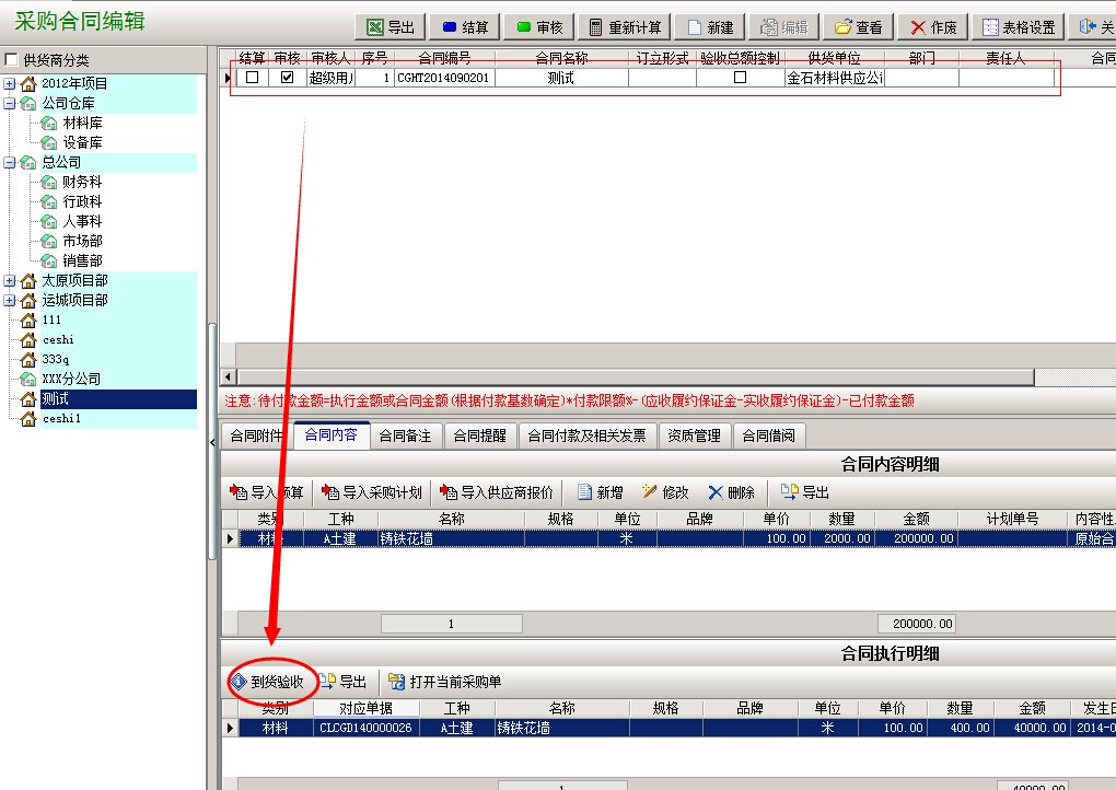 打開采購合同內容,點擊合同執行明細的[到貨驗收]
