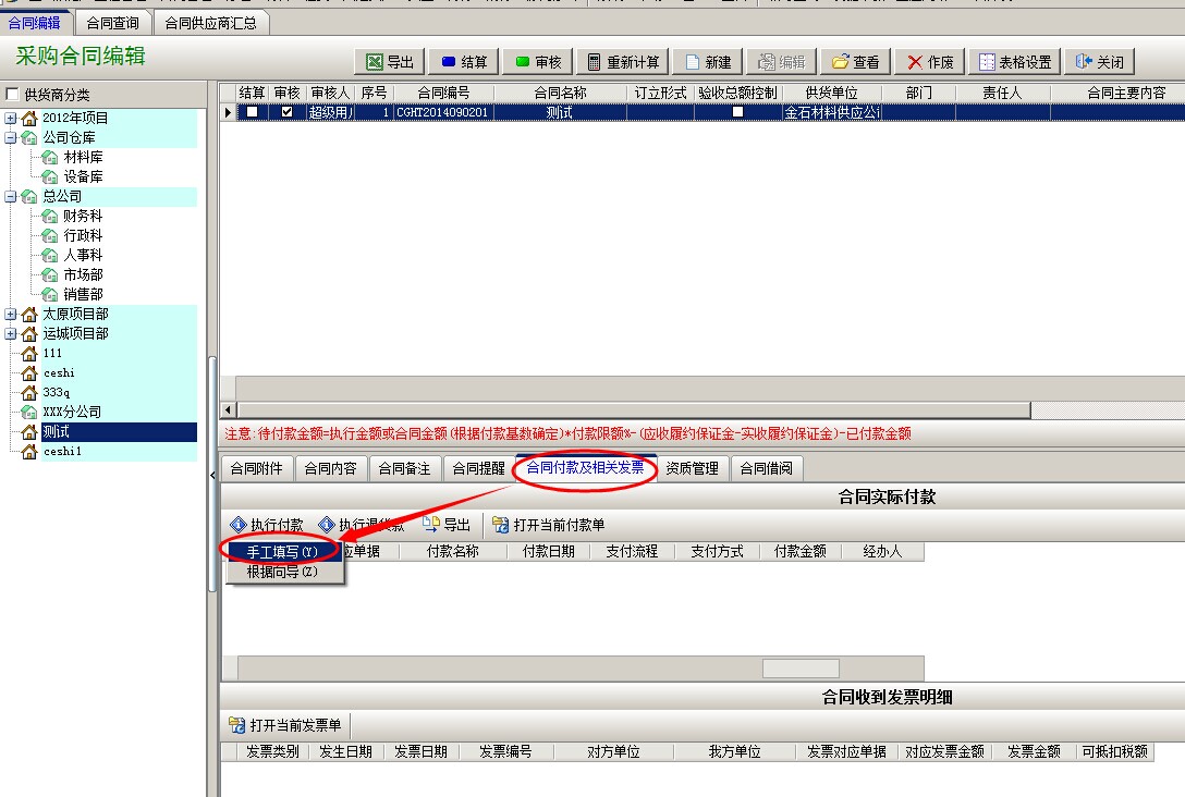合同內容錄入完畢,審核采購合同,在沒有執行到貨驗收的情況下,點擊合同付款及相關發票,執行付款,選擇手工填寫,彈出付款申請單,選擇付款方式,付款明細中輸入付款金額,然后保存 。