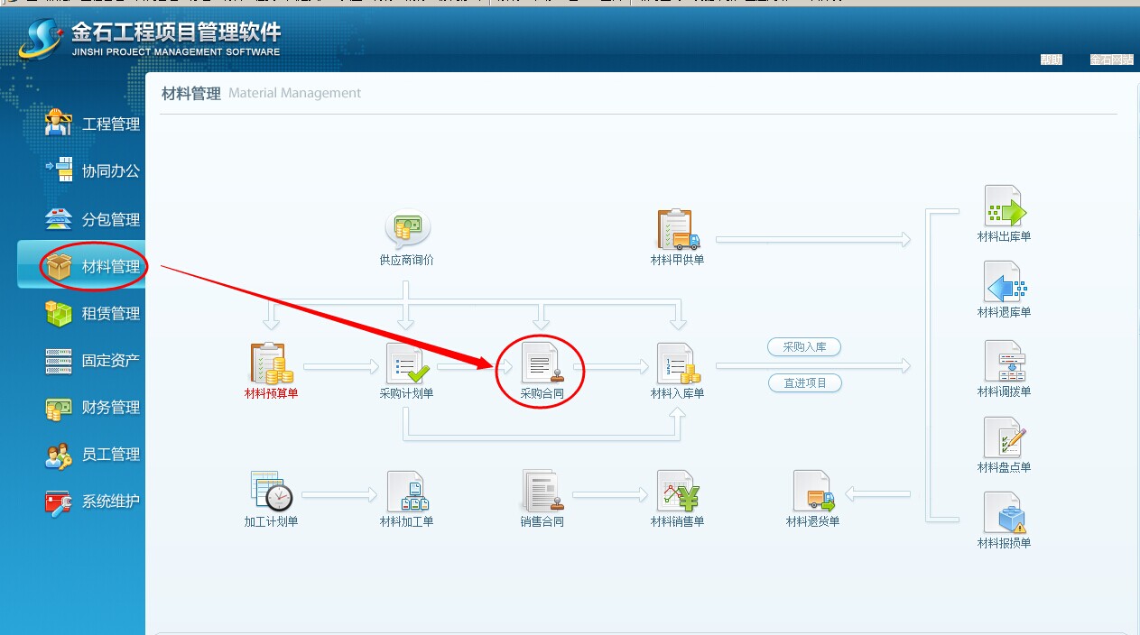 ①簽訂采購合同先付的預付款錄入:打開軟件導航欄材料管理-----采購合同