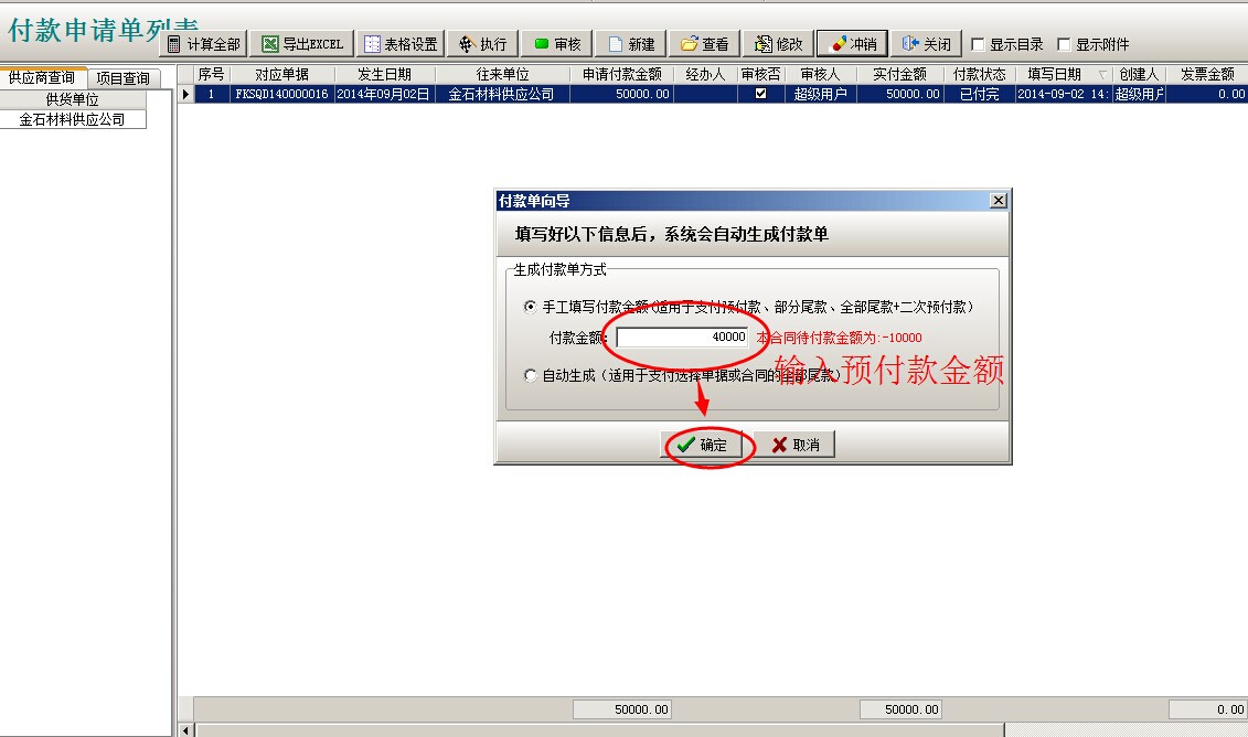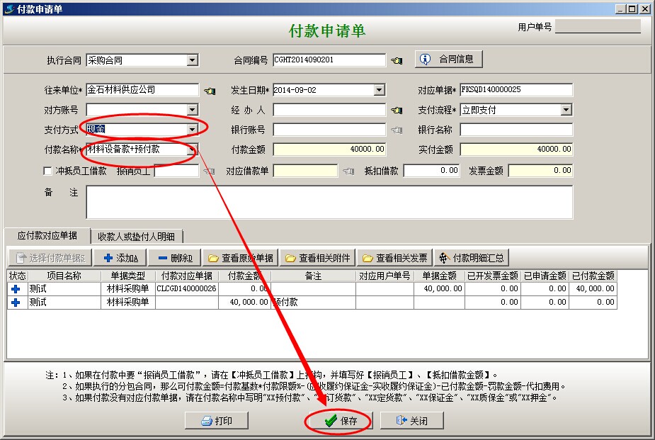 注:上圖所示;付款申請單的兩行明細為兩個材料采購單,第一行的[付款對應單據]為CLCGD140000026已付款金額40000已經等于單據金額(表示該采購單已經付完,是通過上一個付款單自動對應上的付款數),所以付款金額為0,第二行的[付款對應單據]為空,表示本項支付的款項為預付款),上面的付款名稱為材料設備款+預付款;