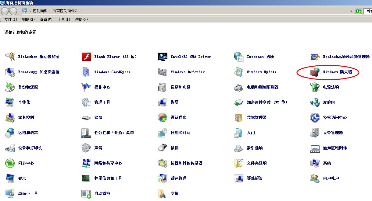 彈出所有控制面板項窗口,找到Windows防火墻項打開