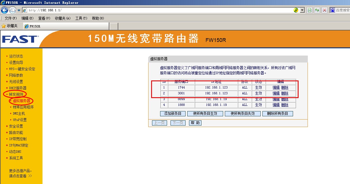 進入路由器,找到轉發規則(路由器型號不同,名稱有差異)分類中的虛擬服務器,會顯示金石軟件兩個端口1744(軟件)和3001(加密鎖)的映射。
