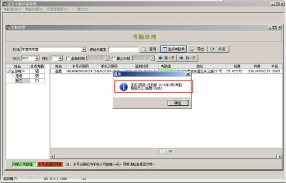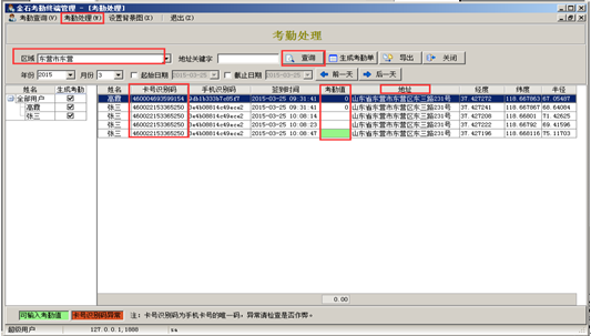 輸入“區域名稱”或者“關鍵字”,點擊“查詢”按鈕可查詢考勤信息,“卡號識別碼”是手機卡號的唯一識別碼,當“卡號識別碼”顯示異常時可檢查是否存在作弊行為,系統自動定位用戶的簽到地址,若簽到信息正常可根據簽到時間在“考勤值”輸入框中輸入對應的考勤值(若同一用戶一天內多次考勤只在最后一次輸入考勤值),如圖: