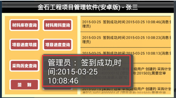 這樣用戶名為test的用戶登錄系統進入到“手機考勤管理終端”就可以查看并處理“東營市東營區”的手機考勤的信息。項目上的工作人員在用手機客戶端簽到的時候,登錄系統,點擊“簽到”的按鈕,簽到成功之后系統提示“簽到成功”并顯示簽到時間,如圖: