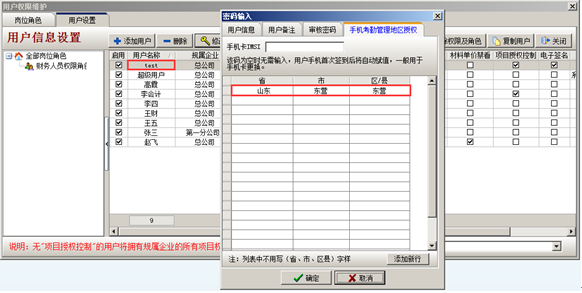 項目上的工作人員不方便到公司簽到,可在安卓手機上下載并安裝好金石軟件的手機客戶端之后登錄手機客戶端進行簽到。需要查詢并處理考勤信息的用戶在查詢信息前要先進入到“系統維護”-“用戶管理權限設置”里面進行“手機考勤管理地區授權”的設置,被授權的用戶就可以查看并處理被授權地區的手機考勤的信息。如圖:
