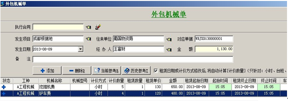 1. 【外包機(jī)械成本】一般用于統(tǒng)計(jì)工程中,租用的吊車(chē)、鏟車(chē)、挖機(jī)等大型機(jī)械設(shè)備所產(chǎn)生的成本。成本根據(jù)外包機(jī)械單來(lái)統(tǒng)計(jì)。