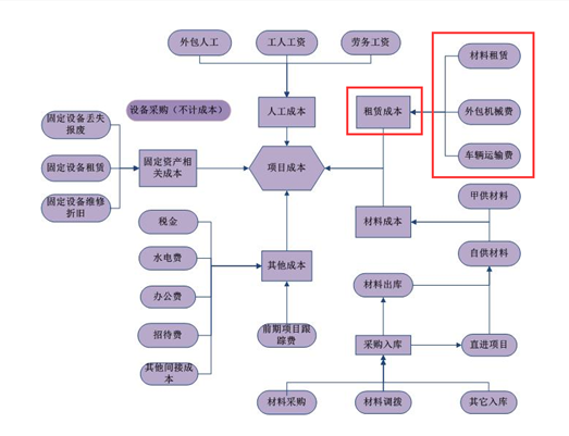 租賃成本,如圖所示:主要分為外包機(jī)械成本、運(yùn)輸車(chē)輛成本和租賃材料成本。