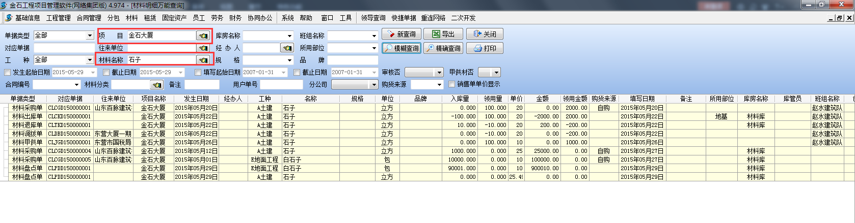 如下圖:查詢項目【金石大廈】所有【石子】材料的采購記錄,(通過【模糊查詢】)