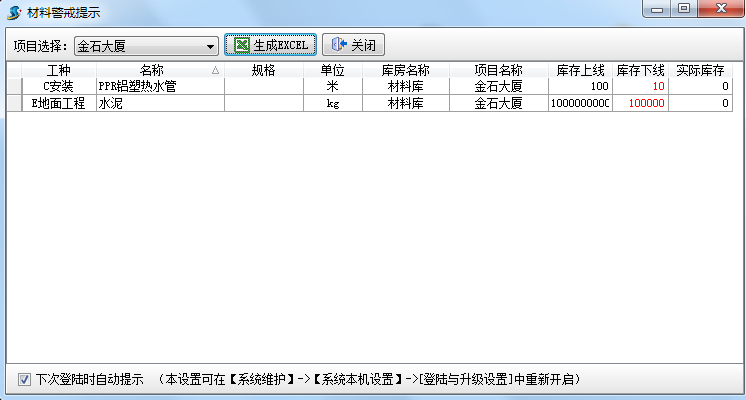 我們也可以設(shè)置登錄軟件時自動提示庫存警戒。設(shè)置好之后當(dāng)材料的庫存量達到了預(yù)警設(shè)置中設(shè)置的上限或者下限,登錄時會自動彈出提示。