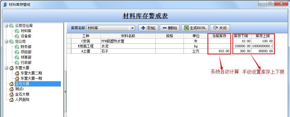 如下圖:選擇項目為【金石大廈】,庫房為【材料庫】后設(shè)置的庫存材料的上限、下限