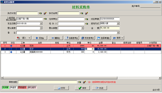 1、利用工程項目材料預算單制訂出項目中材料的目標成本,每種材料的目標用量。有了該目標用量、目標成本就可以控制現場材料的超支采購的預警功能,及事后查詢功能,從而控制采購避免超支浪費、不但實現了量的控制,也實現了價的控制。