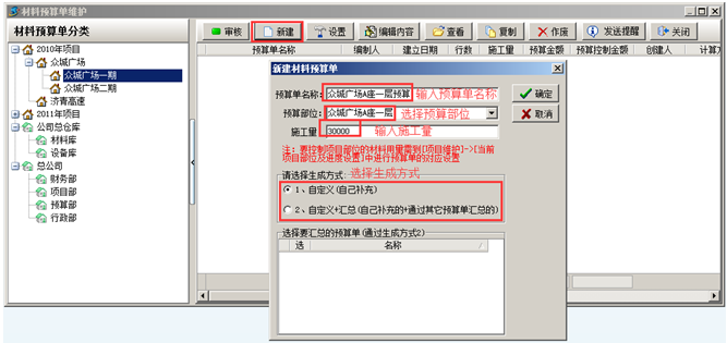 注:選擇第二種生成方式之后,在下面選擇匯總的預算單,確定之后會將選定的預算單內容匯總到當前預算單中。