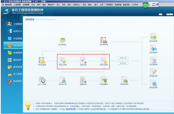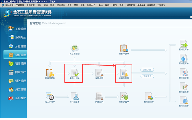 3項目上報采購計劃,審核通過之后簽訂采購合同,然后執行采購入庫 (這種工程項目材料采購流程適合項目上需要有采購環節的采購) 如圖: