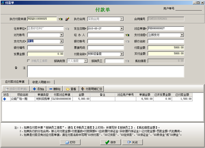 材料入庫完成之后,點擊“合同付款及相關發票”,點擊“執行付款”(付材料款),輸入付款金額。如圖: