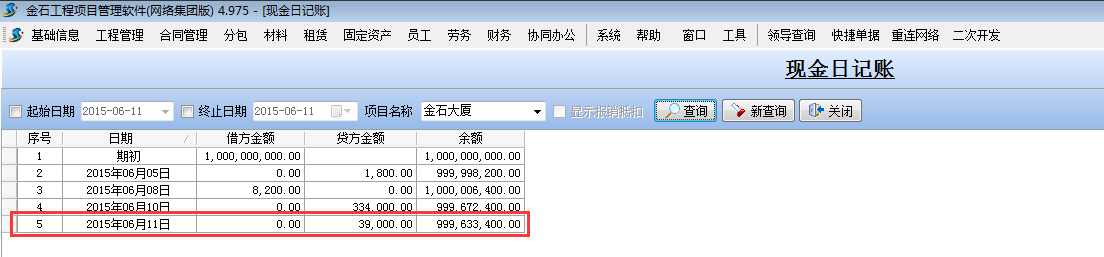 然后我們工地項目管理系統中查詢一下現金流水賬,如下圖