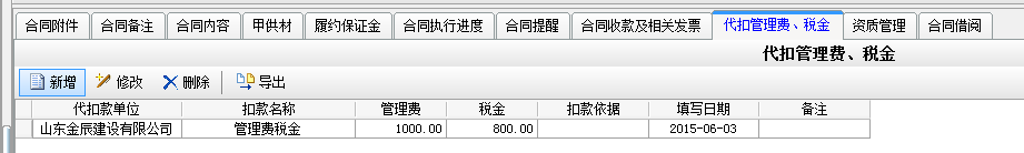 在工程項目資質掛靠管理中因為借用乙方B的資質,需要扣除管理費,如果需要乙方B代開發票還需要扣除稅金。在承包合同中[代扣管理費稅金]模塊下操作,如下圖: