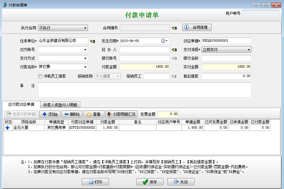 在工程項目資質掛靠管理中因為借用乙方B的資質或者乙方B代開發票需要向乙方B支付管理費和稅金。這時我們需要做其他費用單在做付款申請單或者付款單,具體操作如下: