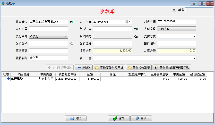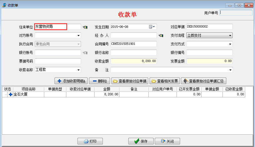 在工程項目資質掛靠管理中如果收取工程款直接在[合同收款及相關發票]模塊填寫收款單,如下圖