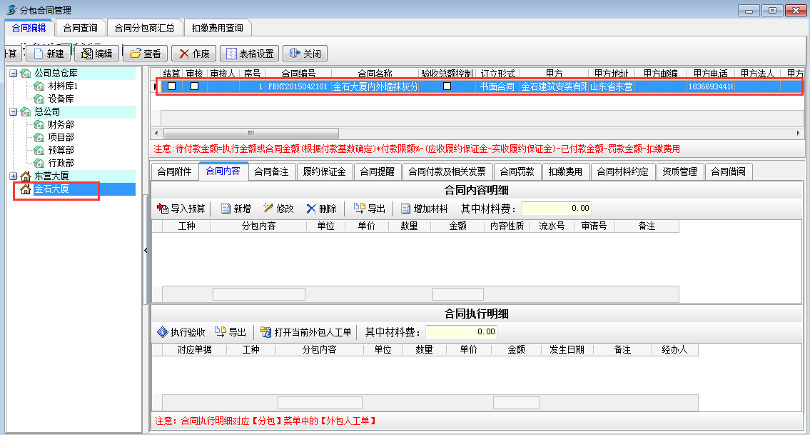 在【合同編輯】中左半部分是合同的分類,分包合同也是按【項目維護】進行分類管理的。一個項目下可以建立多個合同,窗口的右上部分是合同列表,一行信息代表一個合同。右下部位是當前合同相關的內容:【合同附件】、【合同內容】、【合同備注】、【履約保證金】、【合同提醒】、【合同付款及相關發票】、【合同罰款】、【扣繳費用】、【合同材料約定】、【資質管理】、【合同借閱】。