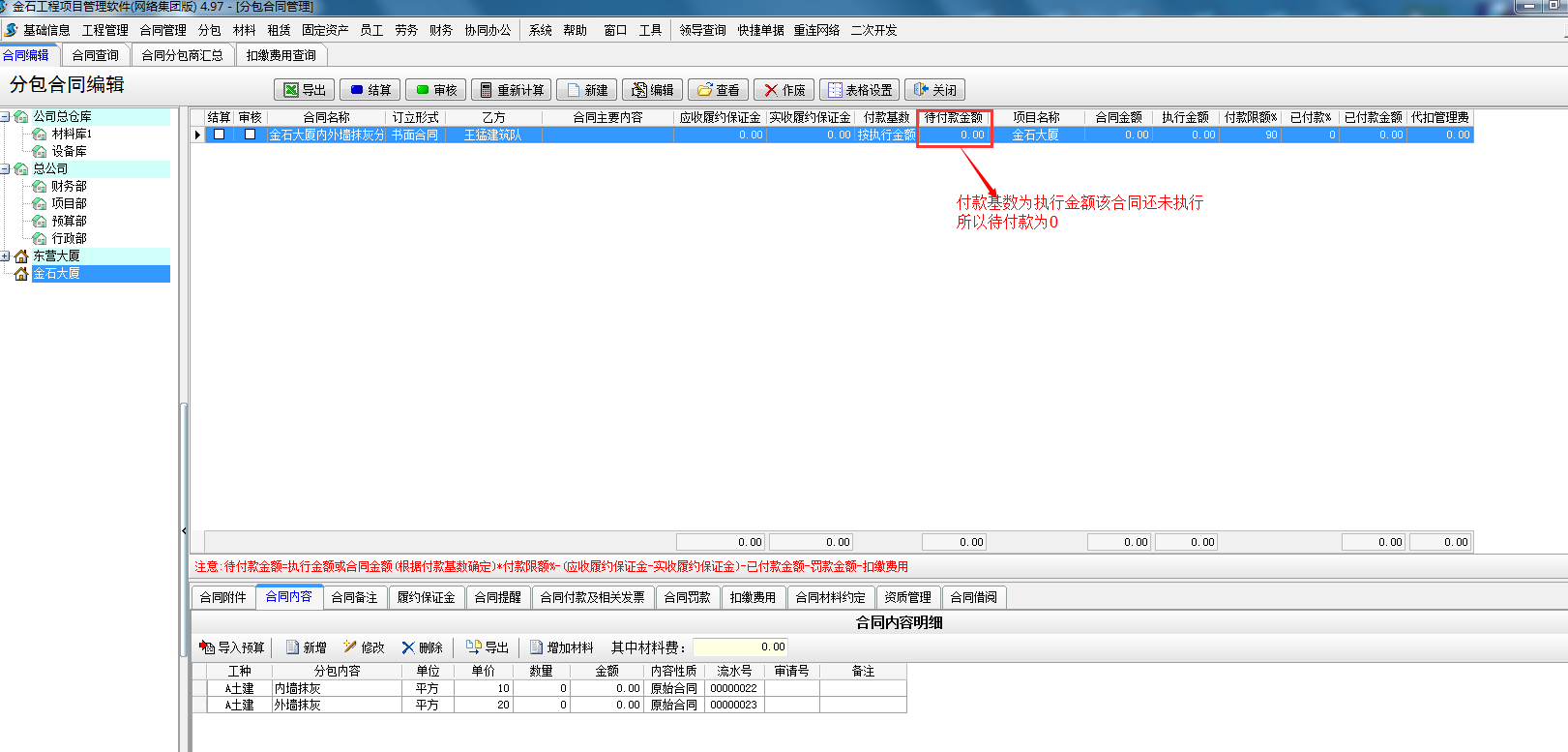 上圖帶紅框的注意填寫正確,其中帶*為必填項。尤其注意【付款基數】、【付款限額】這些項都會直接影響到該合同的待付款。
