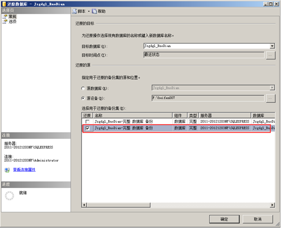 進(jìn)入“指定備份對(duì)話框”,點(diǎn)擊“添加”,進(jìn)入指定數(shù)據(jù)庫(kù)文件窗口,瀏覽并找到需要還原的數(shù)據(jù)庫(kù)備份文件,點(diǎn)擊“確定”, 點(diǎn)擊“確定”后回到指“定備份”對(duì)話框,此時(shí)需要還原的文件已經(jīng)列出來(lái)了,接著點(diǎn)擊“確定”,返回“還原數(shù)據(jù)庫(kù)”。如圖: