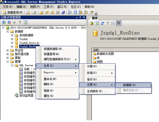 Sql2005數(shù)據(jù)還原時(shí),在“開(kāi)始”-“程序”進(jìn)入資源管理器,登錄需要備份的數(shù)據(jù)庫(kù)服務(wù)器,打開(kāi)企業(yè)管理器后,逐一展開(kāi),看到有數(shù)據(jù)庫(kù)項(xiàng)后,選中數(shù)據(jù)庫(kù)節(jié)點(diǎn)單擊右鍵,選擇“任務(wù)”-“還原”-“數(shù)據(jù)庫(kù)”,如圖: