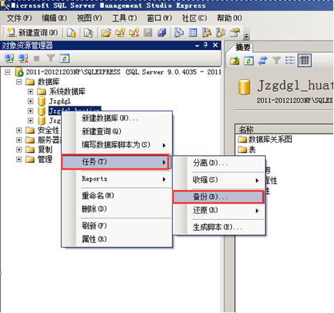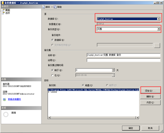 在“對(duì)象資源管理器”找到想要進(jìn)行備份的數(shù)據(jù),選中點(diǎn)擊鼠標(biāo)右鍵,點(diǎn)擊“任務(wù)”-“備份”,彈出“備份數(shù)據(jù)庫(kù)”的對(duì)話框,備份類型選擇“完整”,“目標(biāo)”是備份文件的位置,可以自定義一個(gè)比較好找的目標(biāo),這樣備份以后就可以方便的找到備份文件了,設(shè)置完成點(diǎn)“確定”即可,然后到目標(biāo)目錄下找到備份文件就是所需的備份文件,如圖: