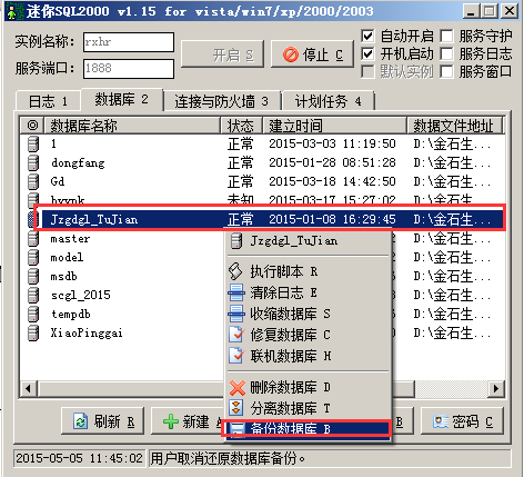 Sql2000數(shù)據(jù)備份時(shí),在電腦的右下角點(diǎn)擊迷你sql的圖標(biāo)彈出迷你SQL2000的對(duì)話框,選中要備份的數(shù)據(jù)庫(kù)名稱。點(diǎn)擊鼠標(biāo)右鍵選在“備份數(shù)據(jù)庫(kù)”,彈出“另存為”的對(duì)話框,選擇備份文件保存的地址,輸入備份文件的名字,然后點(diǎn)擊“保存”的按鈕,如圖:
