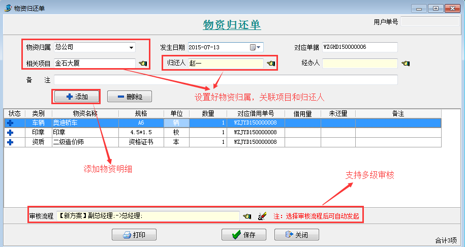 【物資歸還單】是用來統(tǒng)計借用人歸還物資的業(yè)務單據(jù)。