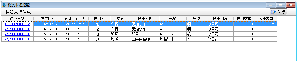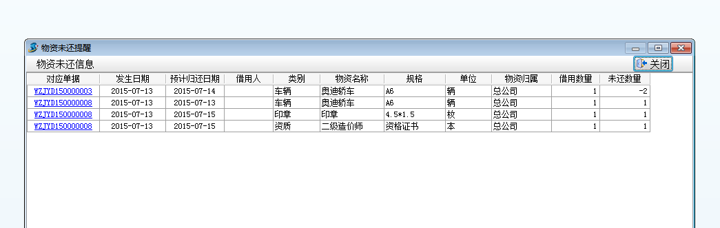 在填寫物資借用單時,填寫好預計歸還日期,當?shù)筋A計歸還日期時,會自動提醒物資未還信息。如下圖: