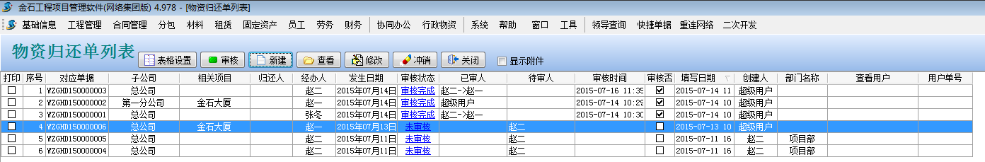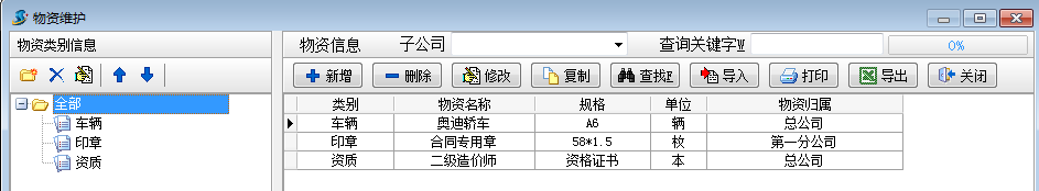 工程項目物資管理可用于管理車輛,印章,證書,資質(zhì),設備,辦公用品等物資的入庫,報損,借用,歸還等過程。錄入相關單據(jù)前,需先錄入要用到的基礎信息中的【物資維護】【子公司信息維護】。