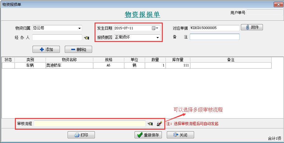 備注:當借出的物資發(fā)生損壞,必須填寫物資歸還單后才可以執(zhí)行報損。