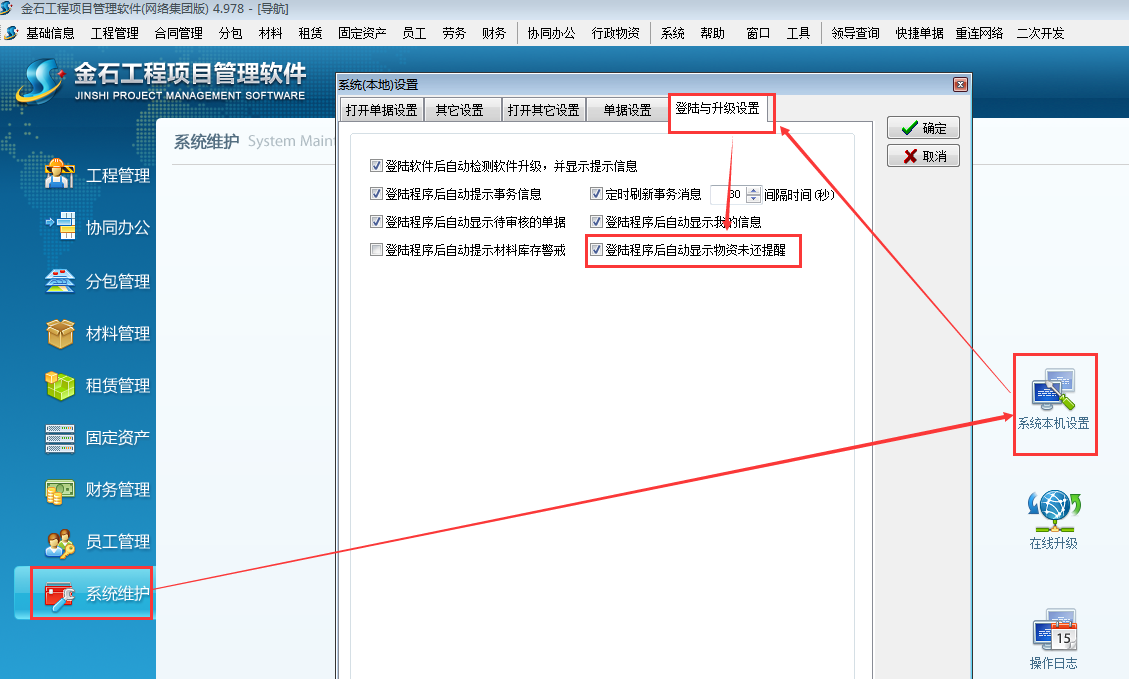 還可以設置登錄客戶端后自動顯示物資未還提醒。