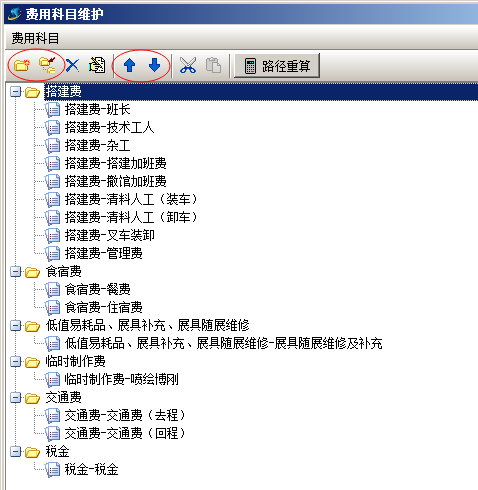 使用左上角圖標(biāo)按鈕,創(chuàng)建費用科目,第一個按鈕的意思是新建平級科目,第二個按鈕是新建子級科目,按上下的箭頭可以調(diào)整上下位置,后面剪刀與文件代表的是復(fù)制與粘貼。