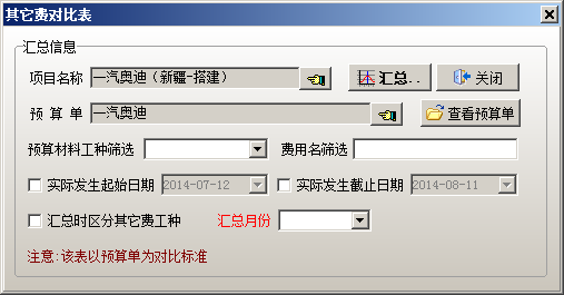 使用時選擇好項目,選擇好預(yù)算單,然后點【匯總】按鈕,進(jìn)行統(tǒng)計。