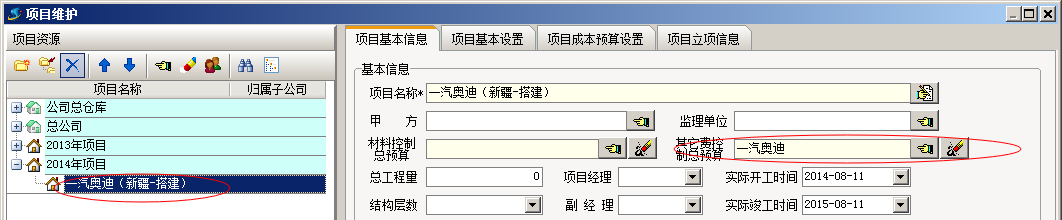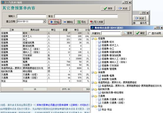 在預(yù)算單中,點【添加】按鈕就會彈出之前設(shè)定好的科目,以供我們選擇使用。添加完成后,點保存按鈕進(jìn)行保存。保存完成后,我們可以在工程管理模塊【項目維護(hù)】中進(jìn)行預(yù)算與項目綁定。