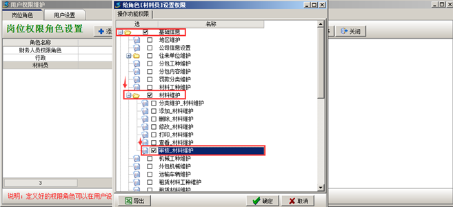 在“系統維護”-“用戶管理權限設置”給具有材料審核權限的用戶分配權限,如圖: