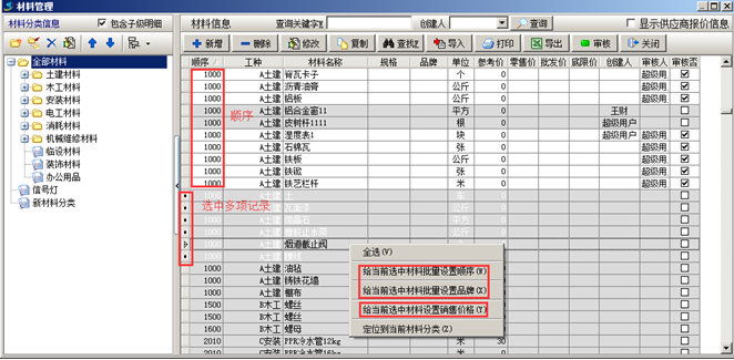 按住鍵盤的CTRL鍵,選中多條材料信息,點擊鼠標右鍵批量設置順序或批量設置品牌。如圖: