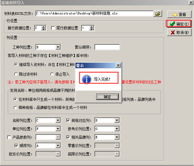規則選擇好并且列名對應完成之后,則導入信息。導入完成系統給出對應提示。如圖: