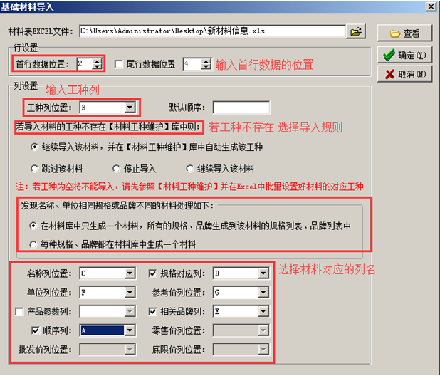 若導入的材料工種不存在,選擇導入規則;