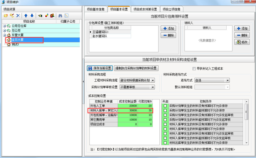 在工程項目管理系統中新建項目時設置成本控制金額和付款控制比例。具體設置方法【工程管理】模塊?【項目維護】項目基本設置