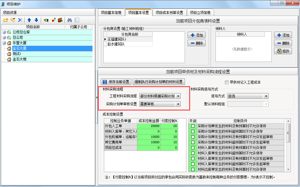 注:要讓材料采購的流程先走【采購計劃單】,必須要在【項目維護】->【項目基本設置】->【材料采購流程】設置為(1、根據(jù)采購計劃單。2:部分材料根據(jù)采購計劃)。