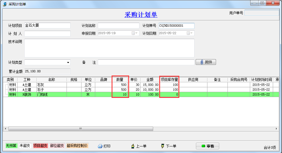 2.在工程項目管理系統(tǒng)中.建立采購計劃單時還可以查看項目庫存量,根據(jù)項目庫存量來確定采購數(shù)量。同時采購計劃單還可以進行多級審核,對材料進行數(shù)量和價格的分別審批。如下圖