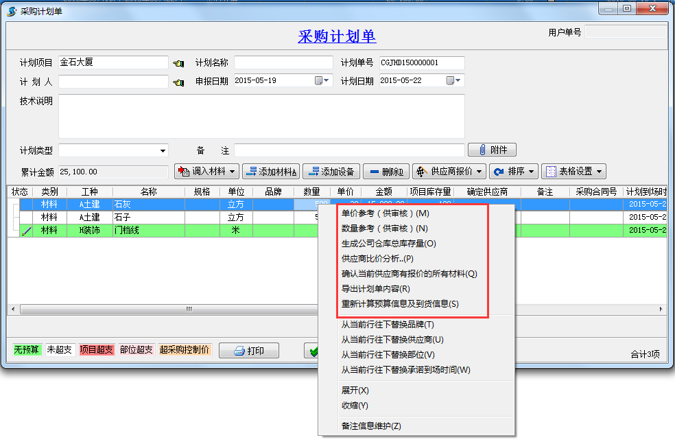在工程管理軟件中企業(yè)制定合理的采購計劃,可以有效地規(guī)避風險,減少損失;更有利于資源的合理配置,以取得最佳的經(jīng)濟效益;同時又為企業(yè)組織采購提供了依據(jù)。